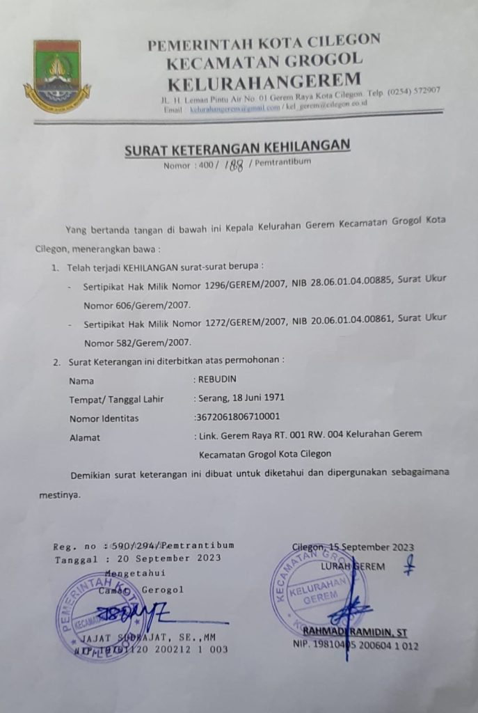 Keterangan dibuat berdasarkan SKPT dari Kantor ATR/BPN Cilegon nomor : 16951/2023 tanggal 07/09/2023. Surat Keterangan dari Kantor Kelurahan Gerem nomor 400/188/Pemtrantibum tanggal 15 September 2023 dan Surat Pernyataan dari Pemohon an H REBUDIN tanggal 04 September 2023.