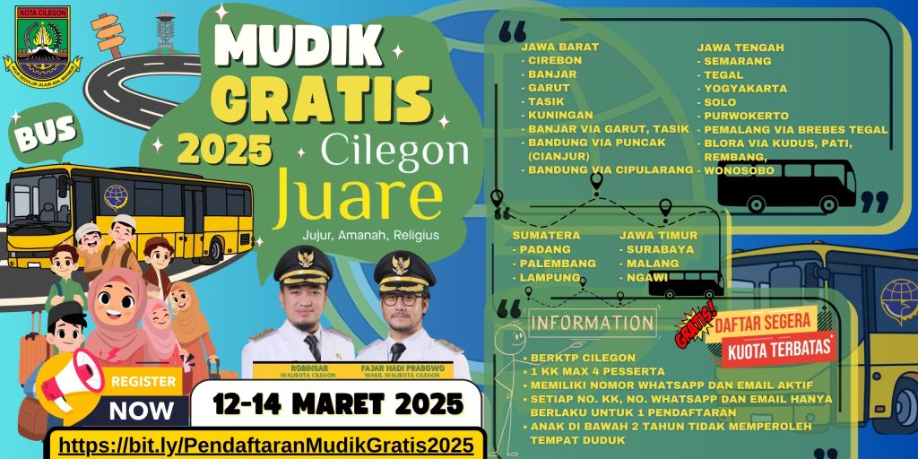 Berikut adalah link pendaftaran dan tujuan mudik gratis Pemkot Cilegon tahun 2025 :