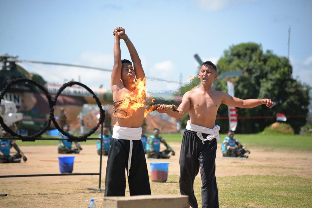 Penampilan alat musik tradisional Tek Tek turut menambah suasana hangat dan penuh energi. Tidak hanya itu, atraksi bela diri seperti Pencak Silat dan Karate juga ditampilkan dengan semangat dan kekompakan tinggi, disusul dengan formasi atraktif Kolone Senjata yang menunjukkan ketangkasan dan disiplin militer Indonesia.