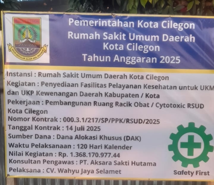 Diketahui bahwa Proyek Pembangunan Gedung Racik Obat / Sitotoksik RSUD Kota Cilegon ini di kerjakan oleh CV Wahyu Jaya Selamet, dan PT Aksara Sakti Hutama selaku Konsultan dengan nilai anggaran Rp. 1. 368. 170.977 melalui Dana Alokasi Khusus tahun 2025. (An/Red)