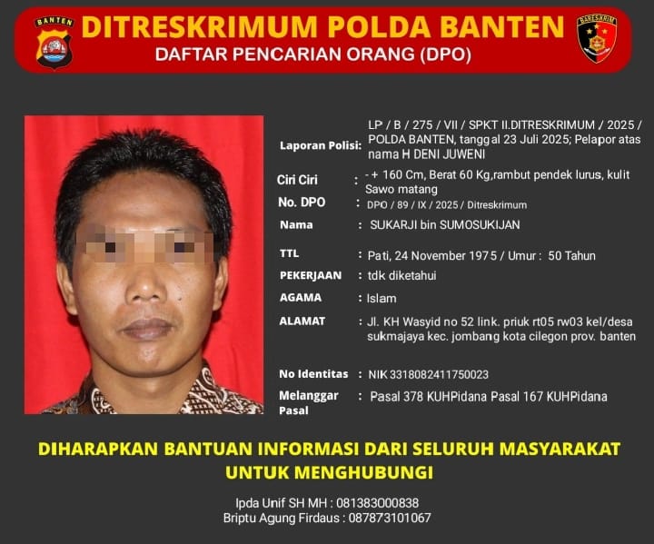 BANTEN, KM – Direktorat Reserse Kriminal Umum (Ditreskrimum) Polda Banten resmi menerbitkan Daftar Pencarian Orang (DPO) terhadap seorang pria bernama Sukarji bin Sumosukijan. Ia diduga terlibat dalam tindak pidana penipuan dan/atau penggelapan sebagaimana dimaksud dalam Pasal 378 KUHP serta Pasal 167 KUHP.